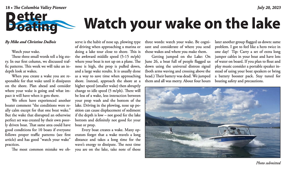 Attached are a few better boating articles written by local boating experts Christine and Mike DuBois. The DuBois' owned and operated Shadybrook Resort and Marina, including a water-sports school, for 26 years. They have coached hundreds of students how to ride as WaterSki Wakeboard Canada Coaches. Christine is also a facilitator for WaterSki Wakeboard Canada, teaching future coaches how to how to drive and teach for water sports. As avid lake users they have a lot of expertise they are willing to share with the Columbia Valley Boating Association and members. We look forward to more articles from the DuBois to help us all become better boaters.