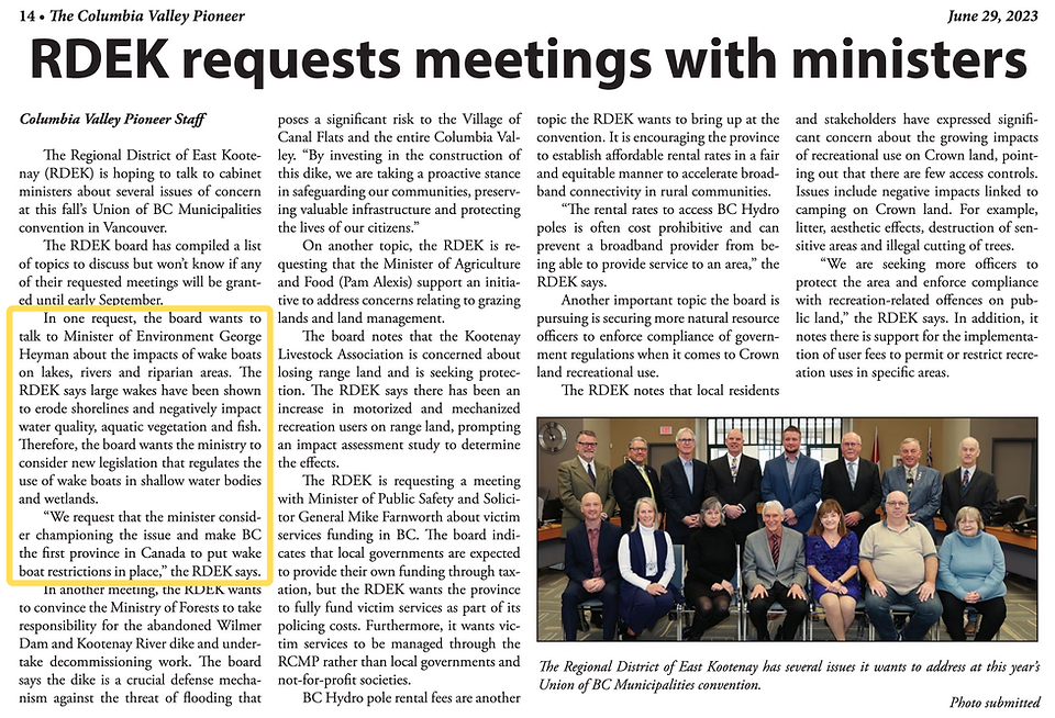 B. Currently, boaters do not have a voice in our local governments. Other organizations are persuading our government officials to change the regulations on our lakes so that boaters will no longer have the same freedoms as in the past. Please see the article on page 14 of the June 29, 2023 edition of the Columbia Valley Pioneer newspaper titled "RDEK Requests". (see Education tab) RDEK officials state they "want to talk to the Minister of Environment about the impacts of wake boats ... we request that the minister consider championing the issue and make BC the first province in Canada to put wake wake boat restrictions in place."